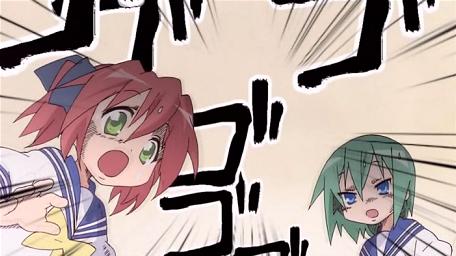 Okay, yeah I’m behind on the series. It’s just not interesting enough for me to want to watch it the day it comes out. But I guess it’s getting a bit more interesting, especially with that Megu-looking character (I’m gonna call her Megu from now on). I think she’s my favorite character now, actually, with her crazy fantasies and manga-drawing and otaku-ism and whatnot. Similar to Konata, except she draws the stuff.